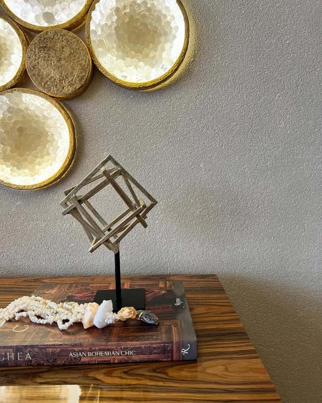 O brilho natural dos cristais interage com a iluminação, criando um efeito dinâmico e luxuoso.