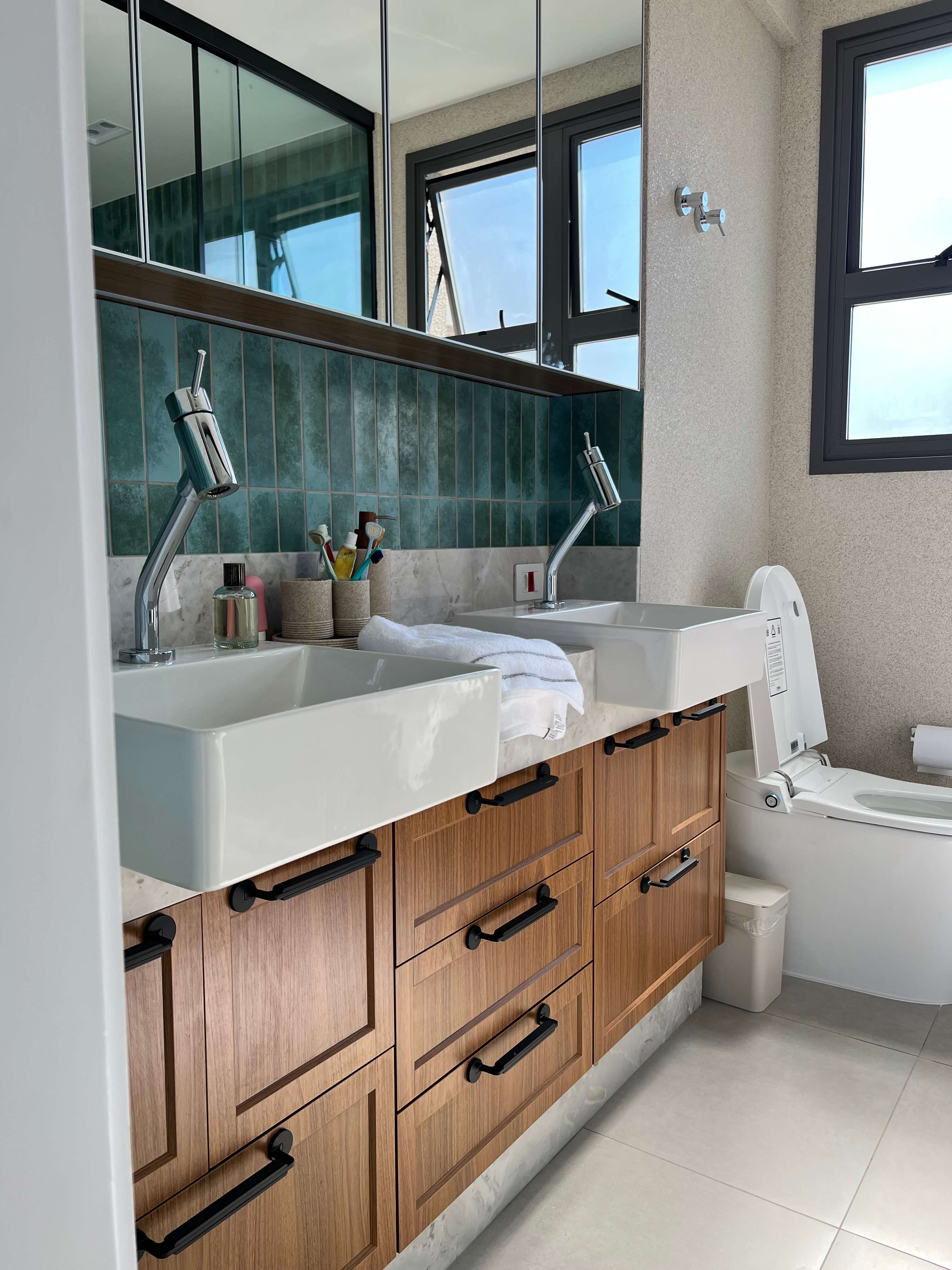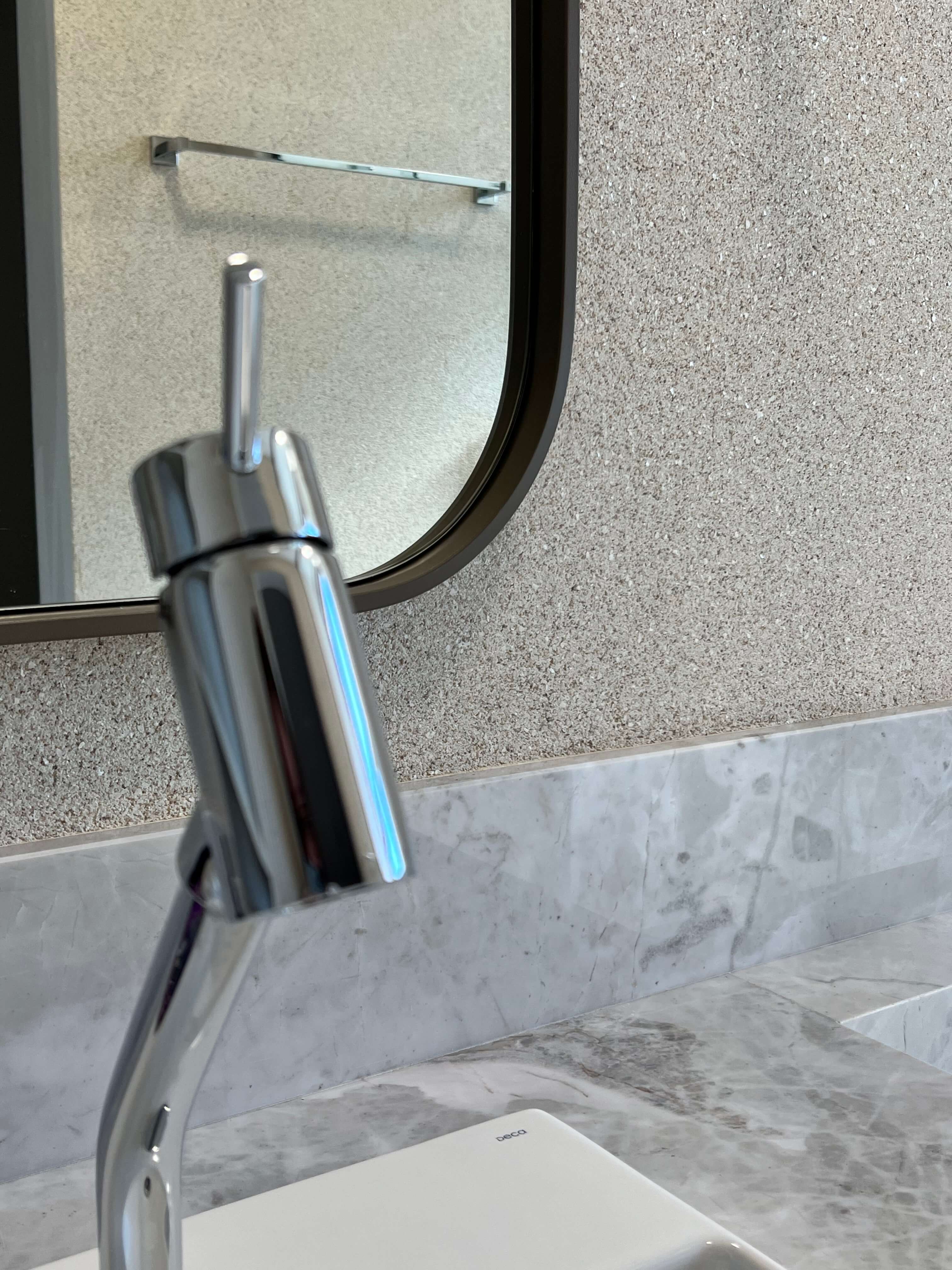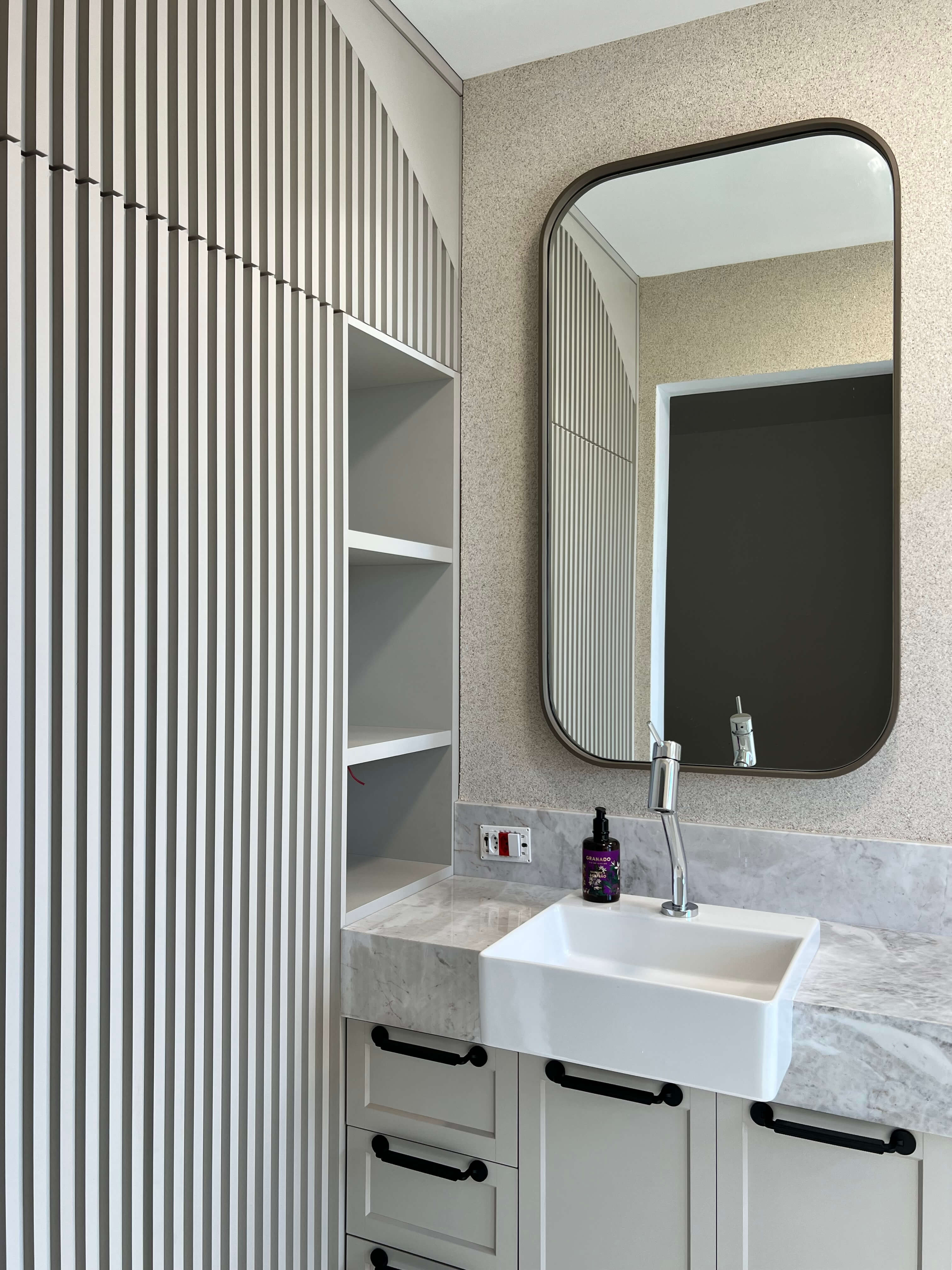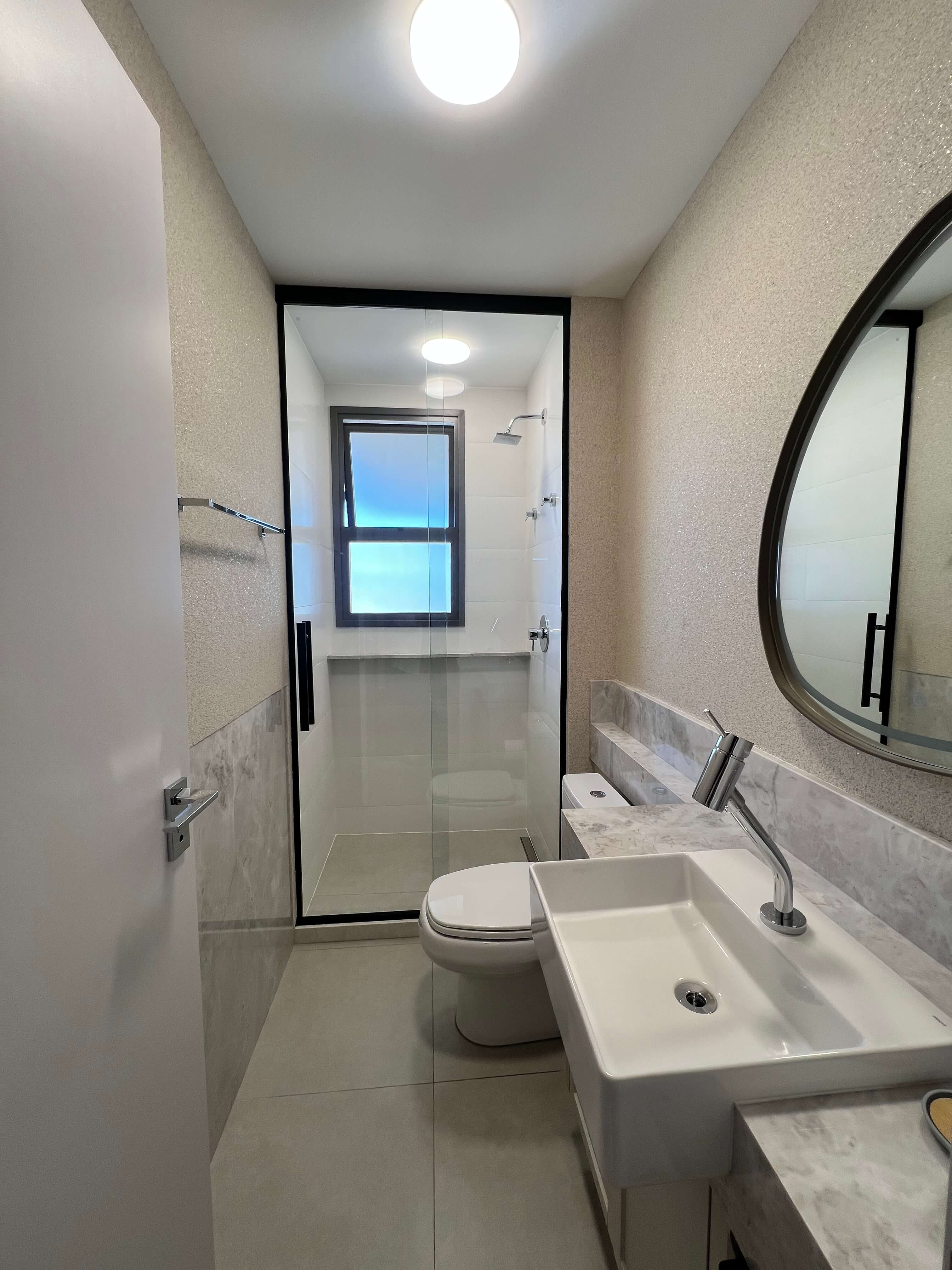 O Apartamento LD teve como destaque a execução completa dos banheiros e lavabos, com a aplicação do revestimento cristal nas paredes, trazendo sofisticação, brilho e uniformidade aos ambientes. O material valoriza a iluminação, amplia visualmente os espaços e garante um acabamento contemporâneo, elegante e de fácil manutenção. Cada detalhe foi pensado para unir estética e funcionalidade, resultando em banheiros e lavabos com alto padrão de acabamento e identidade atemporal.